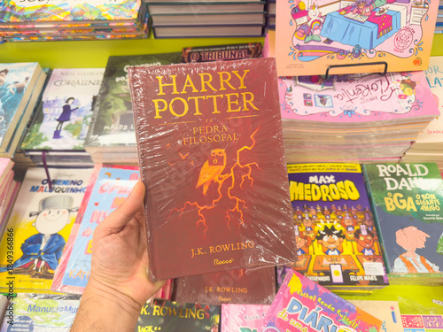 © Torvim, Naklejka premium BELO HORIZONTE, MG, BRAZIL, DECEMBER 12, 2025 A new, plastic-wrapped edition of Harry Potter and the Philosopher's Stone is held in hand at a vibrant bookstore.
