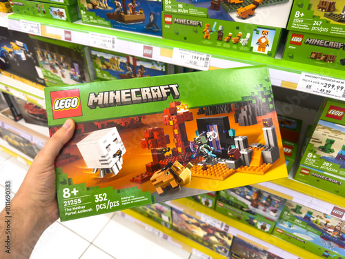 © Torvim, Fototapeta premium BELO HORIZONTE, MG, BRAZIL – NOVEMBER, 17, 2025: A hand holds a LEGO Minecraft "The Nether Portal Ambush" box in a store aisle.