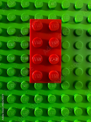© Torvim, Fototapeta premium BELO HORIZONTE, MG, BRAZIL – NOVEMBER, 22, 2025: A red Lego brick centered on a green Lego baseplate.