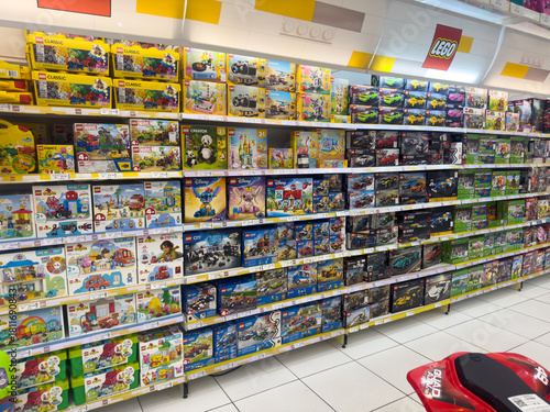 © Torvim, Fototapeta premium BELO HORIZONTE, MG, BRAZIL – NOVEMBER, 17, 2025: Aisle of a toy store with shelves stocked full of various Lego sets.