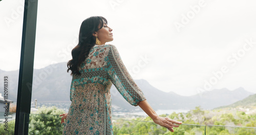 © peopleimages.com, Obraz premium Below, woman and thinking on balcony at hotel for travel, scenic view and fresh air on holiday. Female person, vision or reflection and breathing on terrace, nature greenery and mountain on vacation