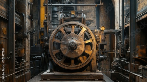 © Artittaya, Fototapeta premium Belt-driven mechanical equipment with visible pulleys and tensioners in a working state