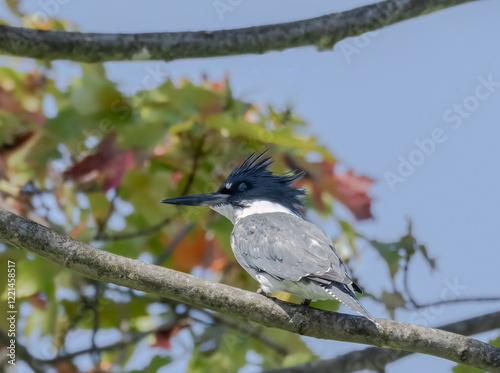 © kburgess, Obraz premium Belted Kingfisher bird in a tree with colourful leaves behind and blue sky