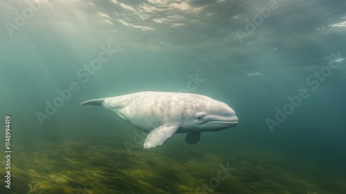 Fototapeta premium Beluga whale in arctic waters with microplastics, symbolizing vulnerability...