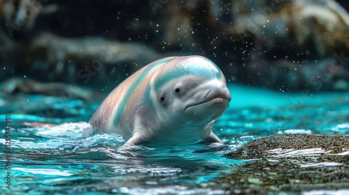 Fototapeta premium Beluga whale swimming in clear turquoise water with gentle bubbles rising around it in a natural habitat setting