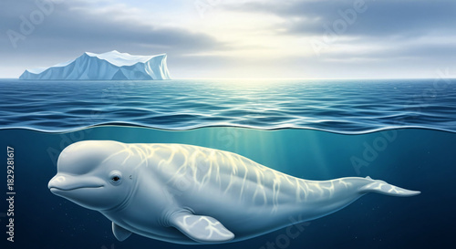Fototapeta premium Beluga whale swimming underwater near iceberg in serene ocean