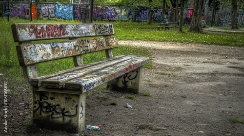 © Leli, Fototapeta premium Bench with graffiti on it sits in a park