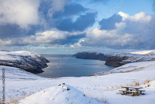 © Markus Rieder, Fototapeta premium bench with ocean view and snow