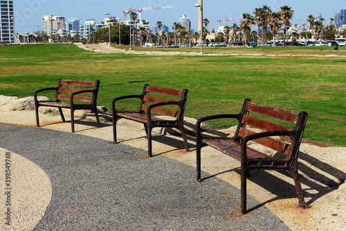 Fototapeta premium Benches on the promenade on the beach in tel Aviv against the background of...