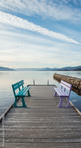 © lina, Fototapeta premium Benches rest on dock overlooking tranquil bay
