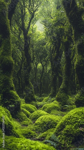 Obraz premium Beneath a canopy of towering trees, dense moss carpets the forest floor,...