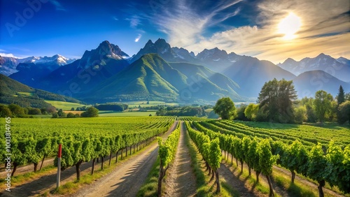 Fototapeta premium Beneath a clear blue sky, lush vineyards flourish, framed by majestic mountains, crafting an idyllic landscape that