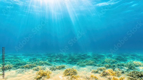 © Chineewan Somsap, Fototapeta premium Beneath serene surface, vibrant coral reefs thrive in clear blue water, illuminated by sun rays, creating tranquil underwater scene