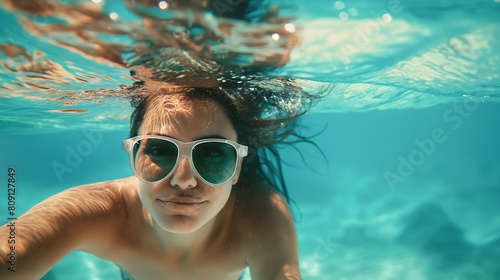Fototapeta premium Beneath the tranquil surface of the sea, a woman swims with effortless grace, her sunglasses perched atop her nose as she explores the hidden treasures of the ocean depths, her smi