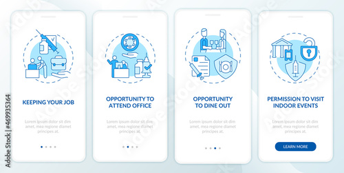 Fototapeta premium Benefits of being vaccinated onboarding mobile app page screen. Keeping your job walkthrough 4 steps graphic instructions with concepts. UI, UX, GUI vector template with linear color illustrations