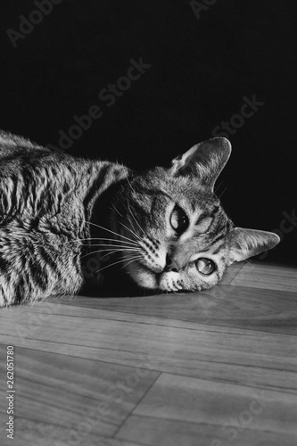 © Дарья Герасимова, Naklejka premium Bengal cat lies on the floor. Black and white portrait. Sad, thoughtful face