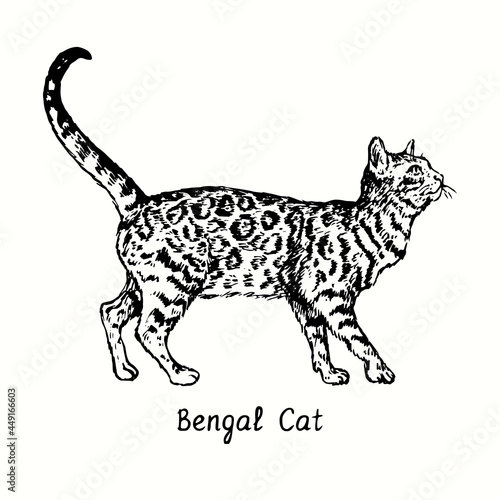 © Artinblackink, Obraz premium Bengal Cat standing side view. Ink black and white doodle drawing in woodcut style.