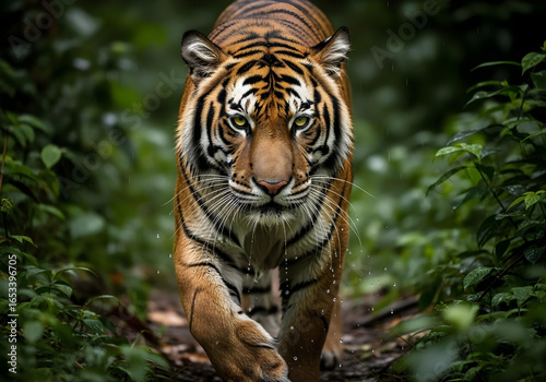 Fototapeta premium Bengal Tiger Walking in Rainforest Rain