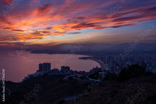 © Azulblue, Fototapeta premium Benidorm cityscape at sunset showing colorful sky and coastline