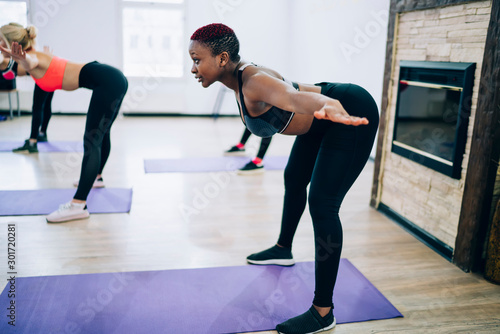Fototapeta premium Bent multiracial women warming up on fitness mats