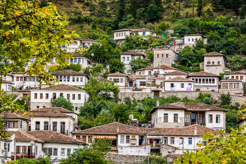 Obraz premium Berat, Albania - July 31, 2014. Detail of houses with brown roofs in Berati