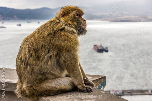 © zauberblicke, Naklejka premium Berberaffe beobachtet die Schiffe auf dem Meer