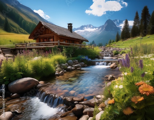 Fototapeta premium Berg­hüt­te mit nach­hal­ti­ger Was­ser­ver­sor­gung durch Ge­birgs­bach
