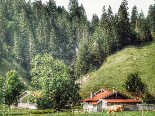 © Bavarianexil, Naklejka premium Bergalm vor Wasserfall