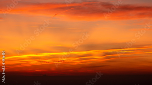 © Matteo Ceruti, Obraz premium Bergamo, Italy. Fiery sunset over the Po valley and the Alps. Clouds that create light red and orange waves. Fabulous contest. Warm colors