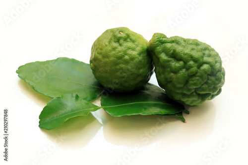 © settapong, Obraz premium Bergamots (Kaffir lime) with leaf isolated in white background.