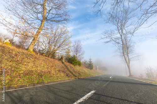 © scaleworker, Fototapeta premium Bergstrasse im Sonnenaufgang und Nebel