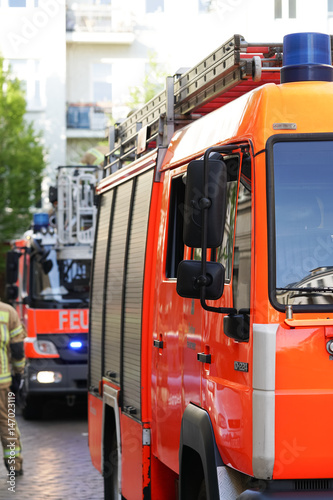 © cineberg, Fototapeta premium Berlin, Germany - April 30, 2017: fire department service truck and firemen. 112 is the single European emergency number that can be dialed free of charge is used for fire and medical emergency