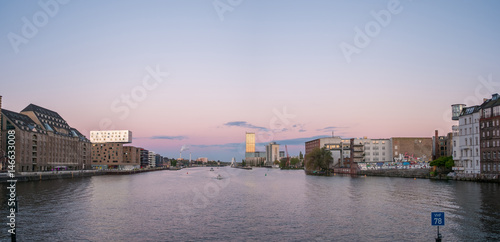 © hanohiki, Obraz premium Berlin skyline - river spree panorama, boats and sunset sky