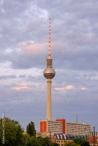 Naklejka premium Berlin TV tower on sunset with beautiful clouds behind.