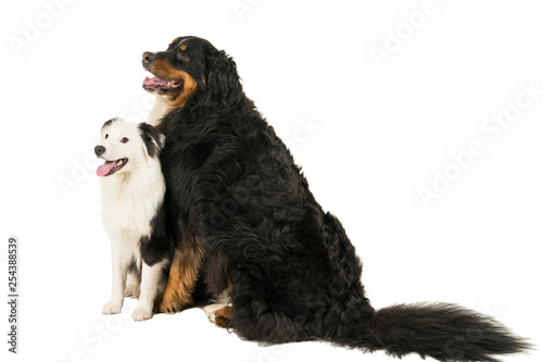 © Leoniek, Obraz premium Berner Sennen Mountain and Australian Shepherd dog sitting on a white background