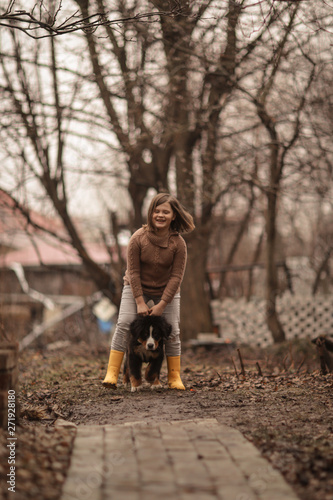 © natalialeb, Fototapeta premium Bernese Mountain Dog puppy runs and jumps with kid