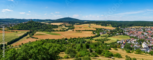 © Frank Wagner, Naklejka premium Übersicht über die mittelhessische Gemeinde Krofdorf-Gleiberg in einer Panoramaaufnahme bei sonnigem Sommerwetter mit Horizont, wolkenlosem Himmel, der Ruine der Burg Vetzberg mit ihrem Bergfried und