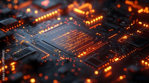 Obraz premium Beryllium copper board with complex circuits, surrounded by soft neon blue...
