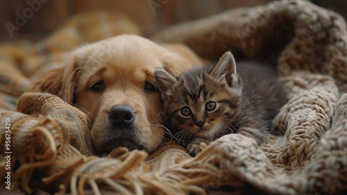 © Anatoli, Obraz premium Best friends cat dog resting on the carpet