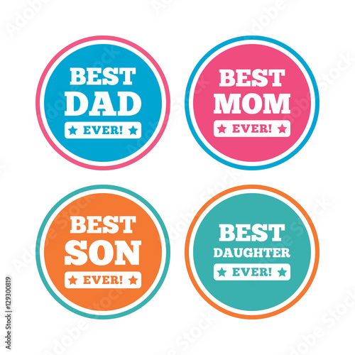 Obraz premium Best mom and dad, son and daughter icons. Awards with exclamation mark symbols. Colored circle buttons. Vector