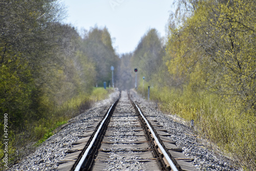 Fototapeta premium Between rails of a railroad in the forest with concrete sleepers.