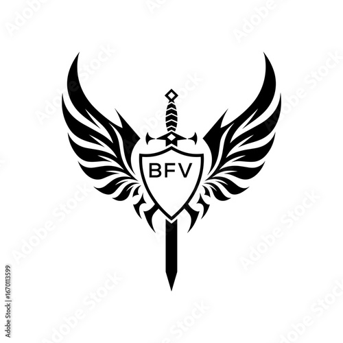 © MDBIRAZ, Obraz premium BFV "Warrior Shield and Sword Emblem with Wings Logo," BFV Later Logo, "Black Tribal Winged Sword Crest Vector,"