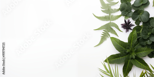 © yeseyes9, Naklejka premium Białe gładkie tło pod baner, grafikę z napisami. Zielone rośliny, gałązki i liście kwiatów. Widok z góry