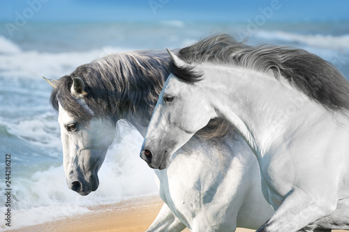 © kwadrat70, Fototapeta premium Białe konie biegną szybko na brzegu oceanu