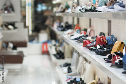 © evakerrigan, Obraz premium białe półki sklepowe z butami i torbami