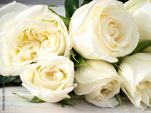 © jittima, Obraz premium Białe róże na białym drewnianym stole