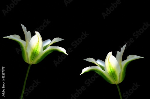 © Lancan, Fototapeta premium Biało zielone tulipany na czarnym tle