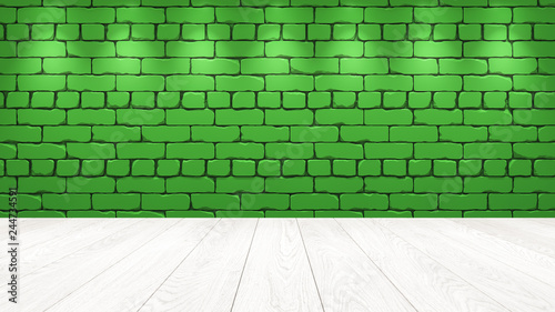 Fototapeta premium Biały, drewniany blat w tle to zielona stara cegła. Efekt reflektora na ścianie - może służyć do wyeksponowania lub montażu renderowania 3d Twoich produktów