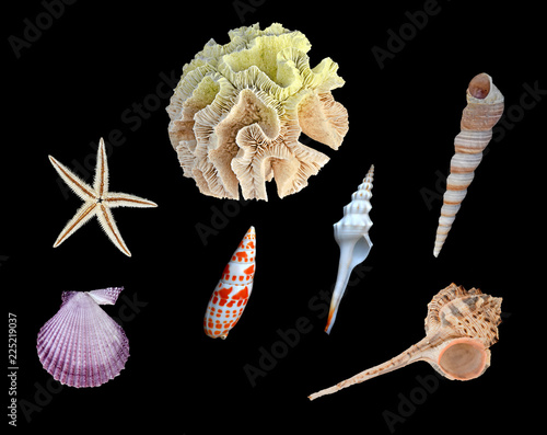 © Dmitry, Obraz premium biały koral, rozgwiazdy i muszle na czarnym tle