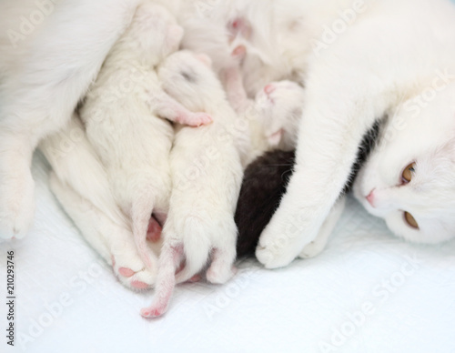 © oksnemova, Fototapeta premium biały kot z nowonarodzonymi kociętami